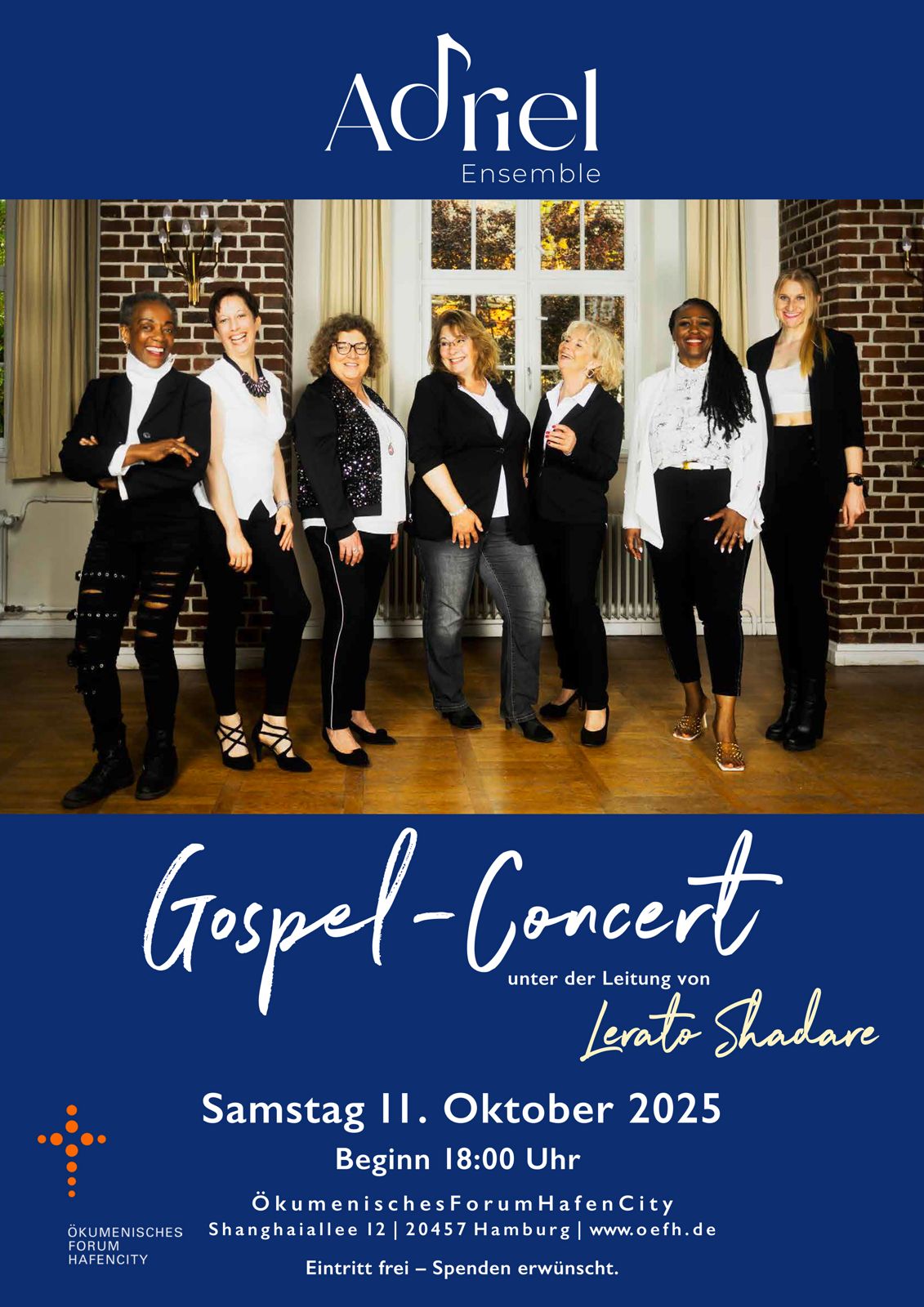 Gospel-Konzert "Adriel" im Ökumenischen Forum HafenCity, Shanghaiallee 12, 20457 Hamburg Das Gospel-Ensemble "Adriel" wurde 2017 als vierköpfige Formation gegründet und besteht heute aus sechs engagierten Sängerinnen unter der Leitung der professionellen Musikerin Lerato Shadare. Erleben Sie Gospelmusik, die Herzen berührt. Eintritt frei - Spende erbeten
